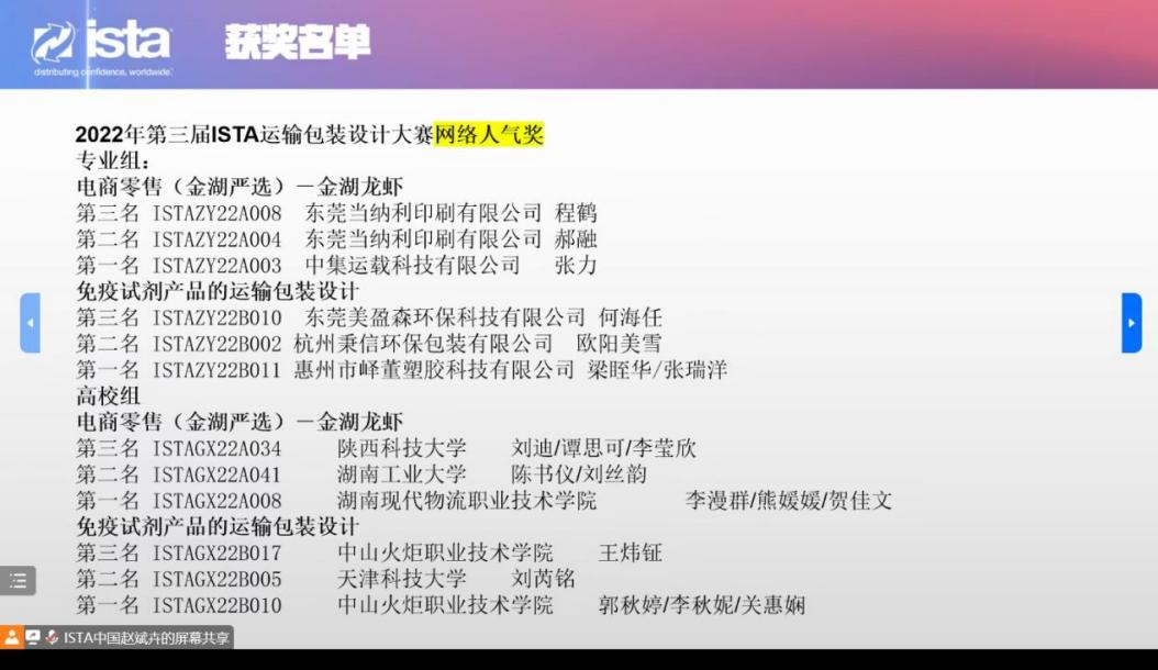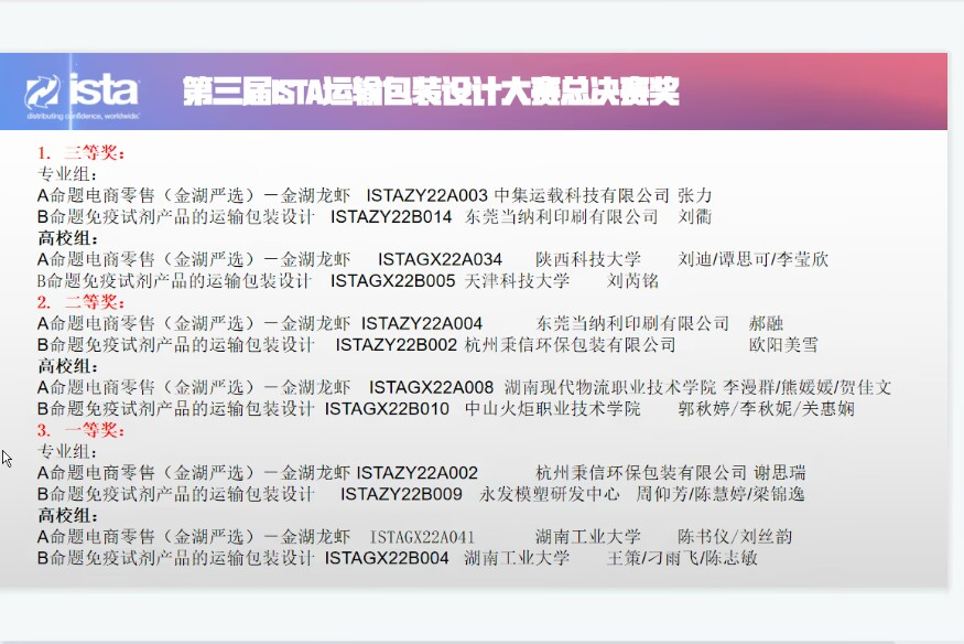 12月10日,第三届ISTA国际安全运输包装设计大赛全国总决赛落下帷幕,我校物流信息学院包装策划与设计专业学生李漫群、熊媛媛、贺佳文等同学历经3个多月,在此次决赛中表现优秀,荣获网络人气奖A命题高校组第一名、A命题包装设计高校组二等奖,向明月、乐水波两位老师获得优秀指导老师奖。