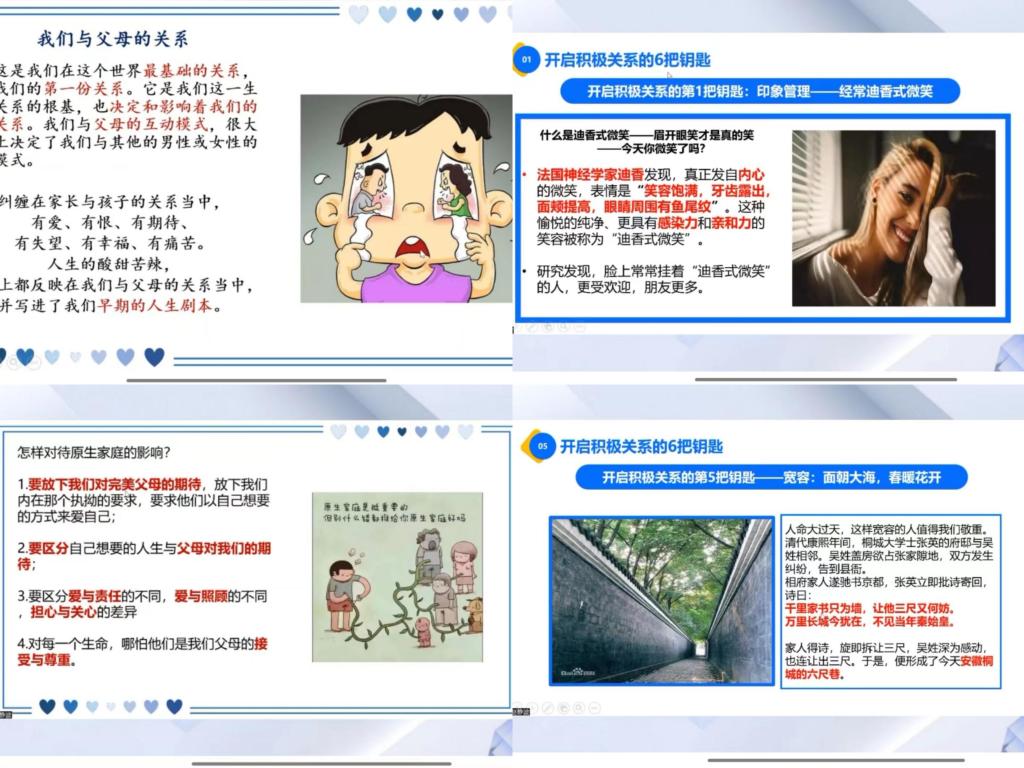 赵静波教授给大家介绍了四个方面的人际关系。第一个人际关系是我们与自己的关系,在成长的道路中,我们要学会真正的爱自己;第二个人际关系是我们与父母的关系,我们与父母之间的功课是一生中最复杂最不可逃避的;第三个人际关系是我们与恋人之间的关系,赵静波教授介绍了大学生恋爱7要素和失恋的心理调节;第四个人际关系是我们与他人的关系,赵静波教授给我们提供了开启积极关系的六把钥匙,并教会大家学会用善意助人、感恩他人、宽容待人以及说话的艺术。