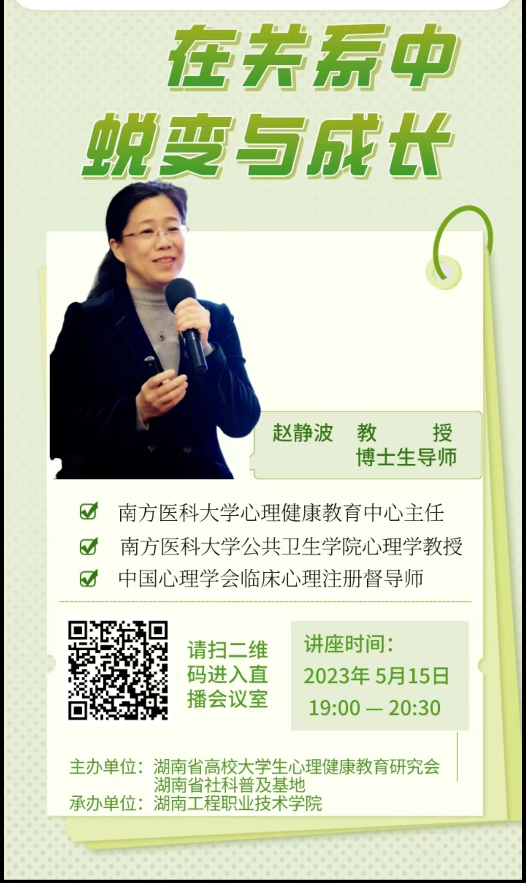 5月15日晚上,我校组织全体学生参加“在关系中蜕变与成长”主题线上讲座。本次讲座是由湖南省高校大学生心理健康教育研究会主办的湖南省高校大学生成长大课堂,讲座专家是南方医科大学心理健康教育中心主任、教授、博士生导师、南方医科大学公共卫生学院心理学教授、中国心理学会临床心理注册督导师赵静波。