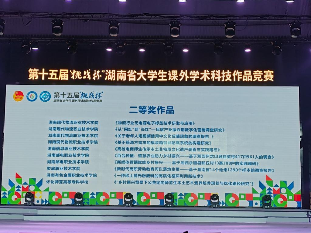 2023年5月20日至5月22日,由团省委、省教育厅、省科协、省社科院、省学联主办,长沙理工大学承办的第十五届“挑战杯”湖南省大学生课外学术科技作品竞赛在长沙理工大学云塘校区举行,我校入围省赛5支参赛团队共得二等奖4项,三等奖1项,团体总分排名全省高职组前列,再次斩获“优胜杯”。