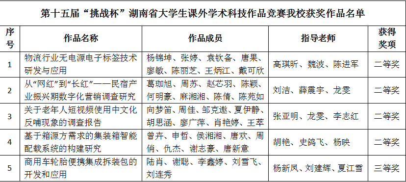 第十五届“挑战杯”湖南省大学生课外学术科技作品竞赛我校获奖作品名单