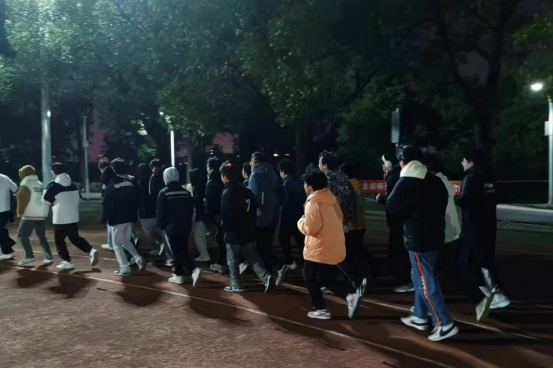 这项活动在鼓励同学们在忙碌地学习之余,关注身体健康,享受运动的乐趣。随着夜幕的降临,校园内的一片空地上热闹非凡。夜晚的体育场微风习习,同学们在老师的带领下进行热身运动,为夜跑做足准备。同学们按照既定的路线开始夜跑。他们迈着矫健的步伐,沿着校园田径场的跑道奔跑,脸上洋溢着青春的笑容。夜幕下的校园在同学们的脚步声中显得格外充满活力。